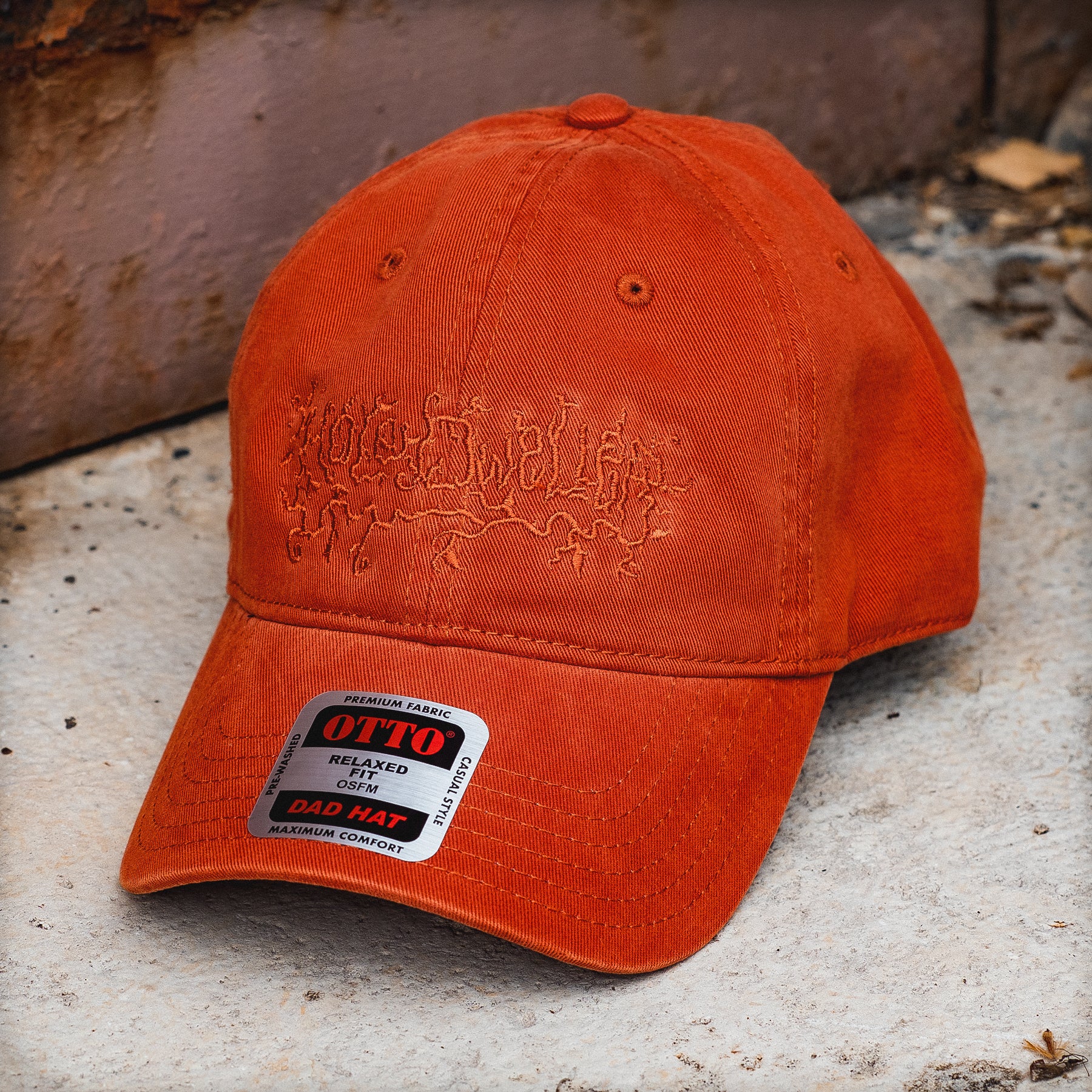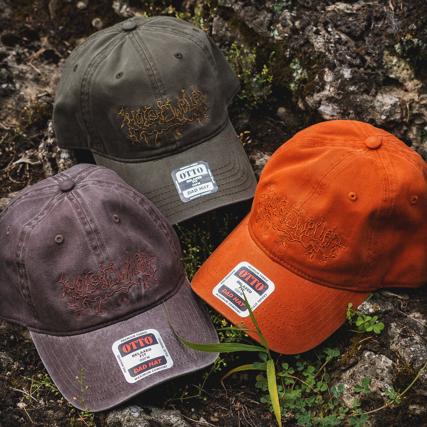 Old school Hole Dweller logo embroidered on a Dad Hat with monochrome stitching.