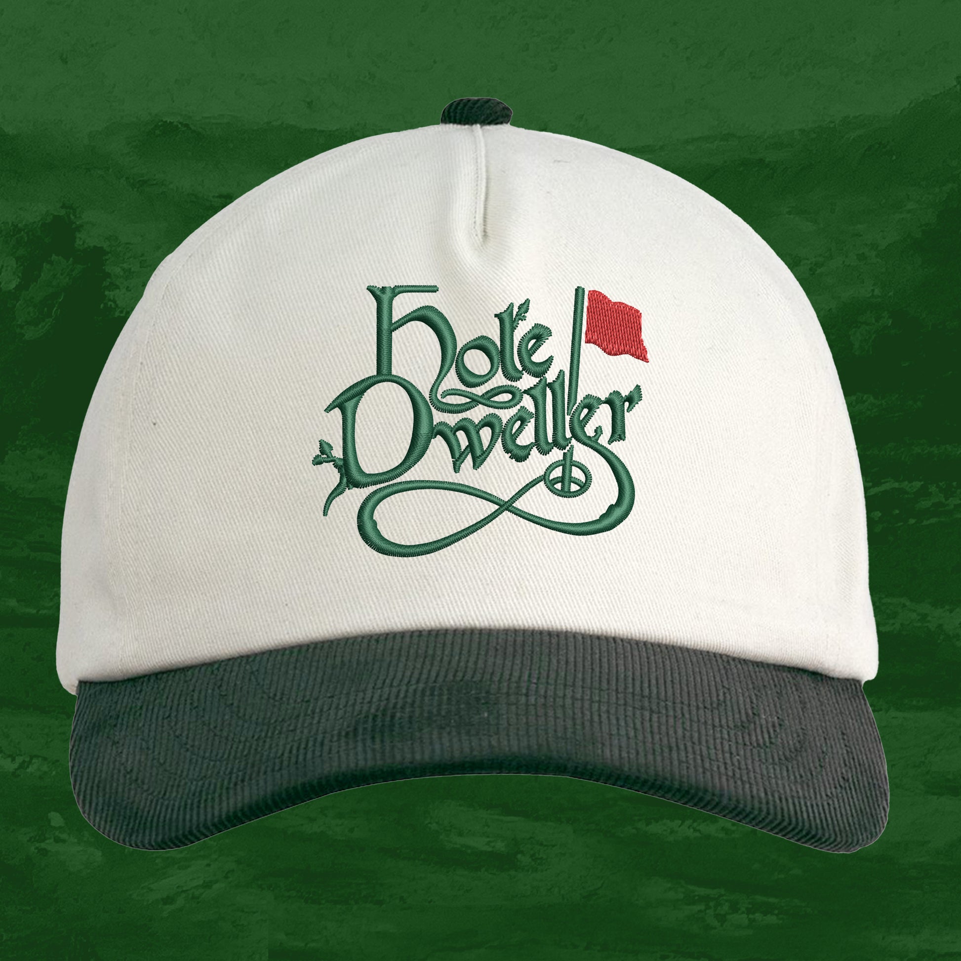 Cream cap with forest green corduroy bill and accents.